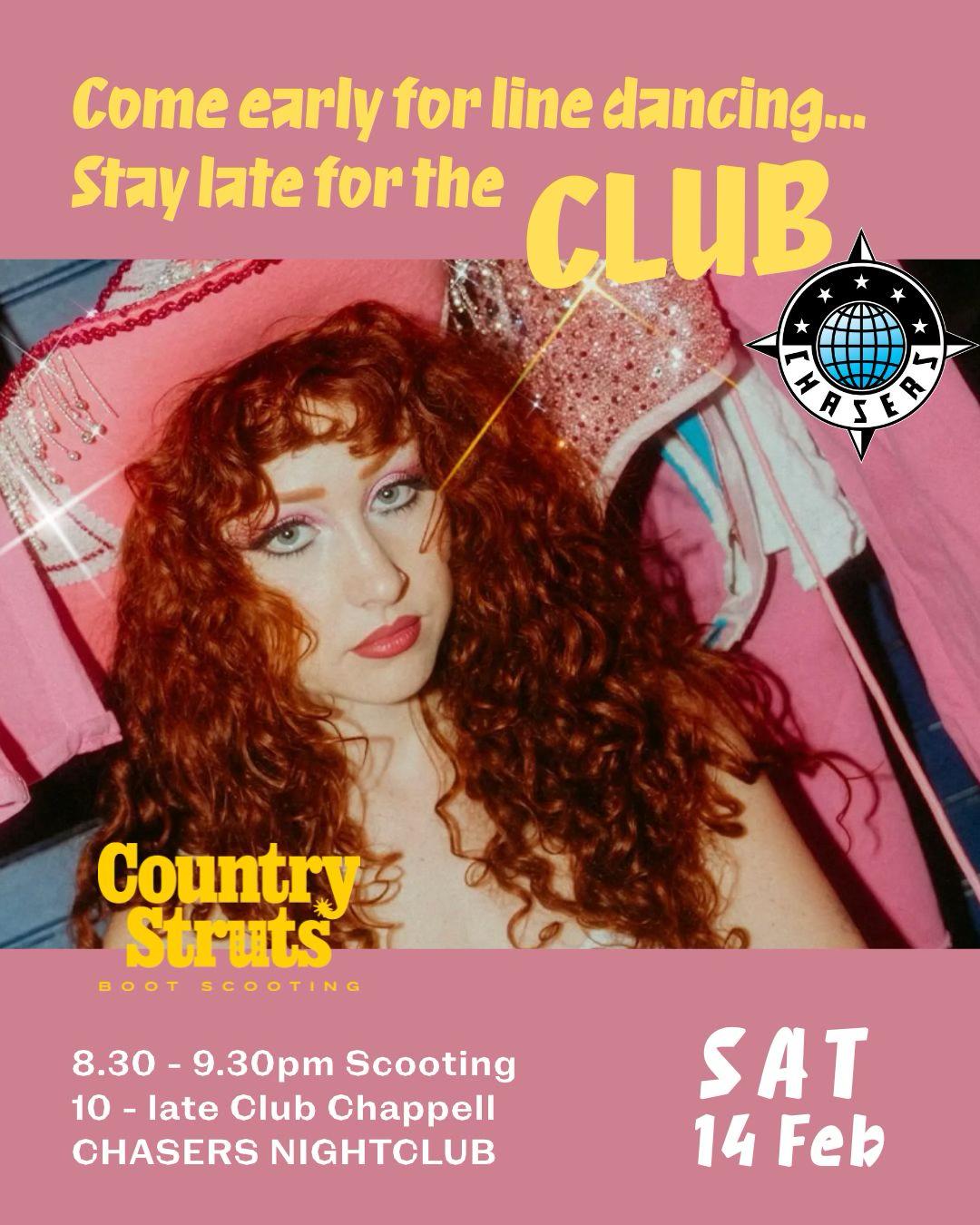 One hour beginner friendly line dancing class to all the Chappell hits. No experience needed to strut your stuff! TIMES: ✷ 8.00PM – Doors, come grab a drink! ✷ 8.30 – 9.30PM – Country Struts Boot Scooting lesson ✷10PM – Onwards Club Chappell