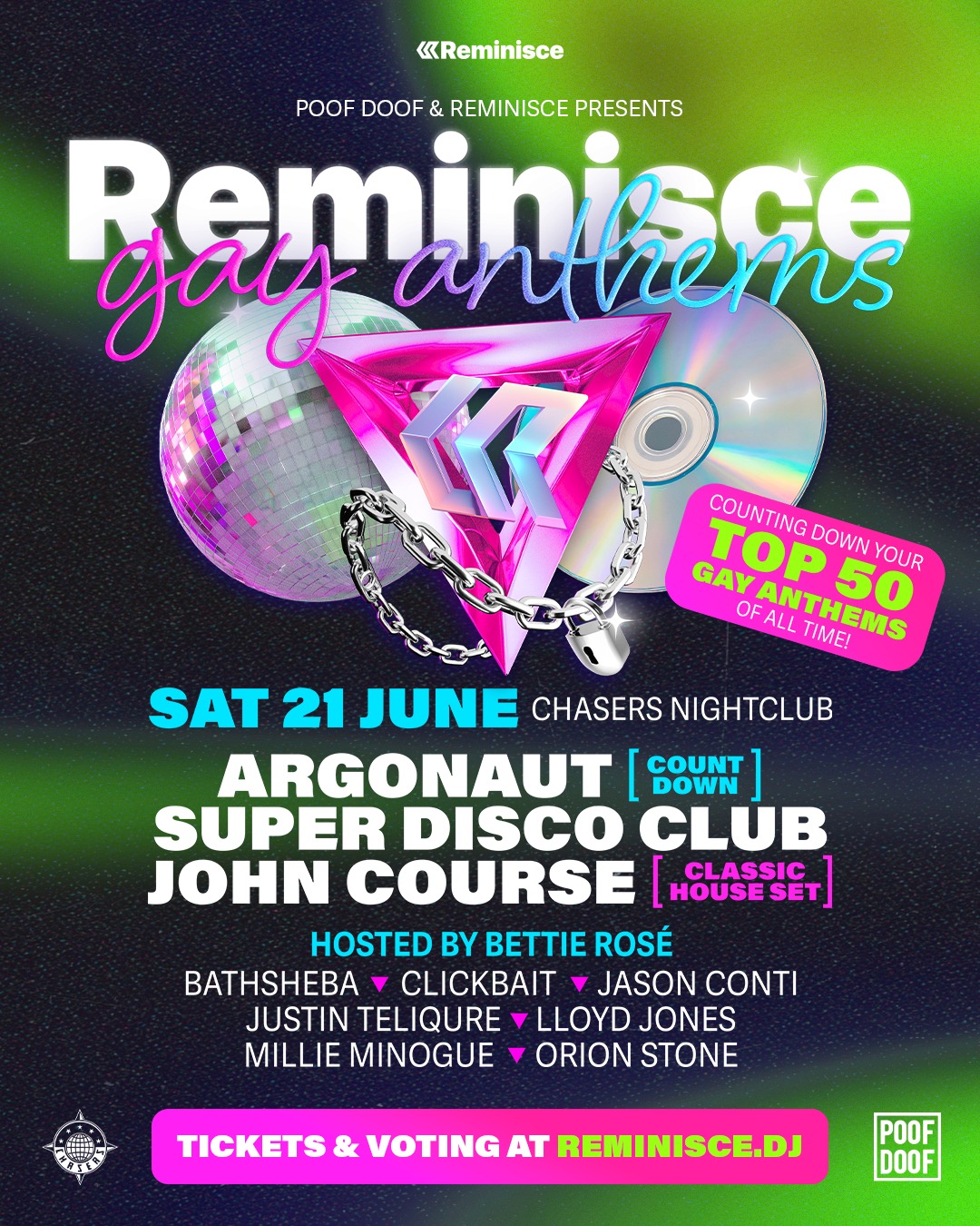 On Saturday 21 June, Reminisce: Gay Anthems is returning to POOF DOOF Melbourne for a big, sweaty countdown of the Top 50 Gay Anthems of All Time, as voted by YOU! Think wall-to-wall gay classics – zero skips, and big singalong energy.